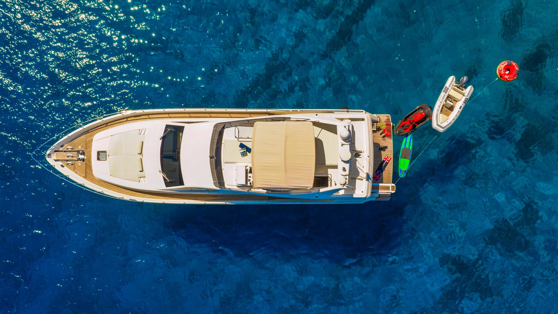 Dominique truly stands out thanks to her excellent balance of performance and versatile outdoor living spaces. Guests can enjoy three dining areas, including elegant salon, the shaded aft deck, and the spacious flybridge, which also features a wet bar and comfortable sunpads. In addition, the foredeck offers another pleasant space for sunbathing while enjoying panoramic views. The wide swim platform makes Access to the sea effortless; therefore, water activities such as jet skiing, paddleboarding or snorkeling become part of Daily fun on bord. Altogether, Dominique successfully combines relaxation, entertainment and performance, making her a wonderful choice for an unforgettable charter experience.