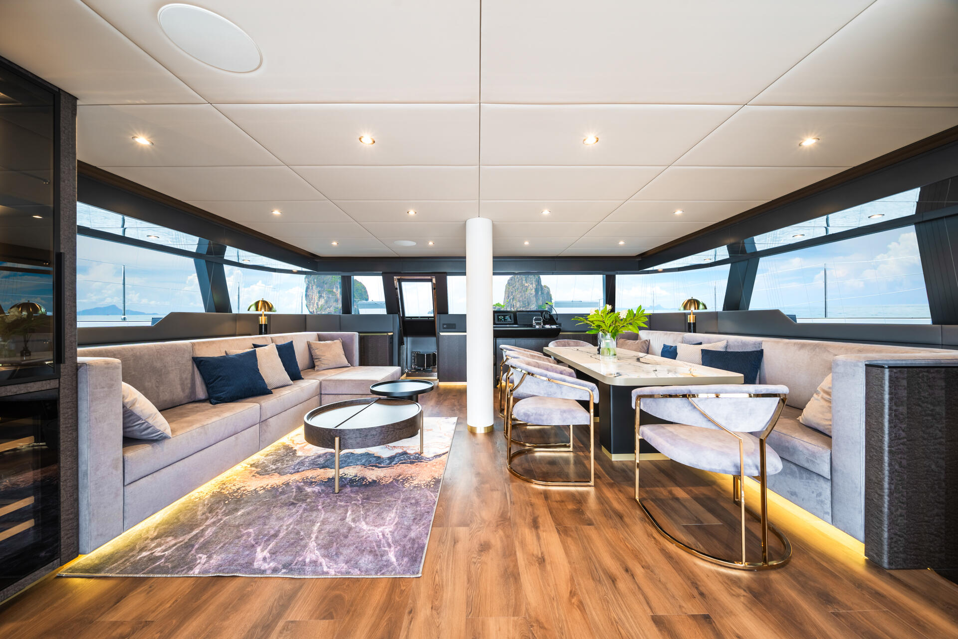 Mr. Si accommodates up to eight guests in four beautifully appointed suites, including a spacious Master cabin and three double guest cabins. Each cabin features a private ensuite bathroom, individual climate control, and contemporary finishes in soft tones complemented by marble and wood accents. The configuration across both hulls ensures privacy for all guests while maintaining a comfortable onboard flow. In addition, generous storage and well-proportioned sleeping areas enhance overall comfort. With a dedicated crew of three providing attentive yet discreet service, guests can fully relax and enjoy a seamless yachting experience from the moment they step on board.