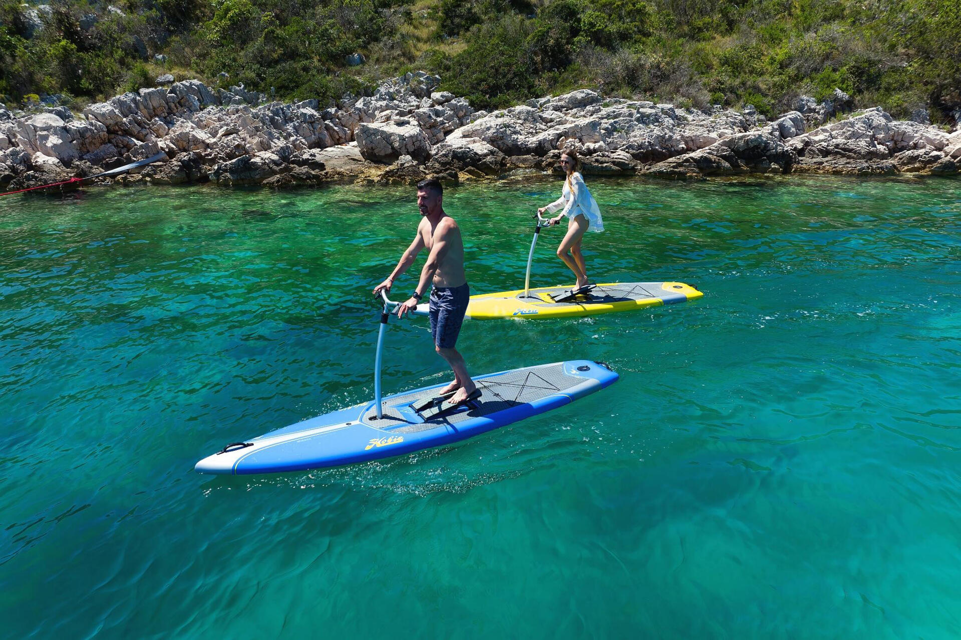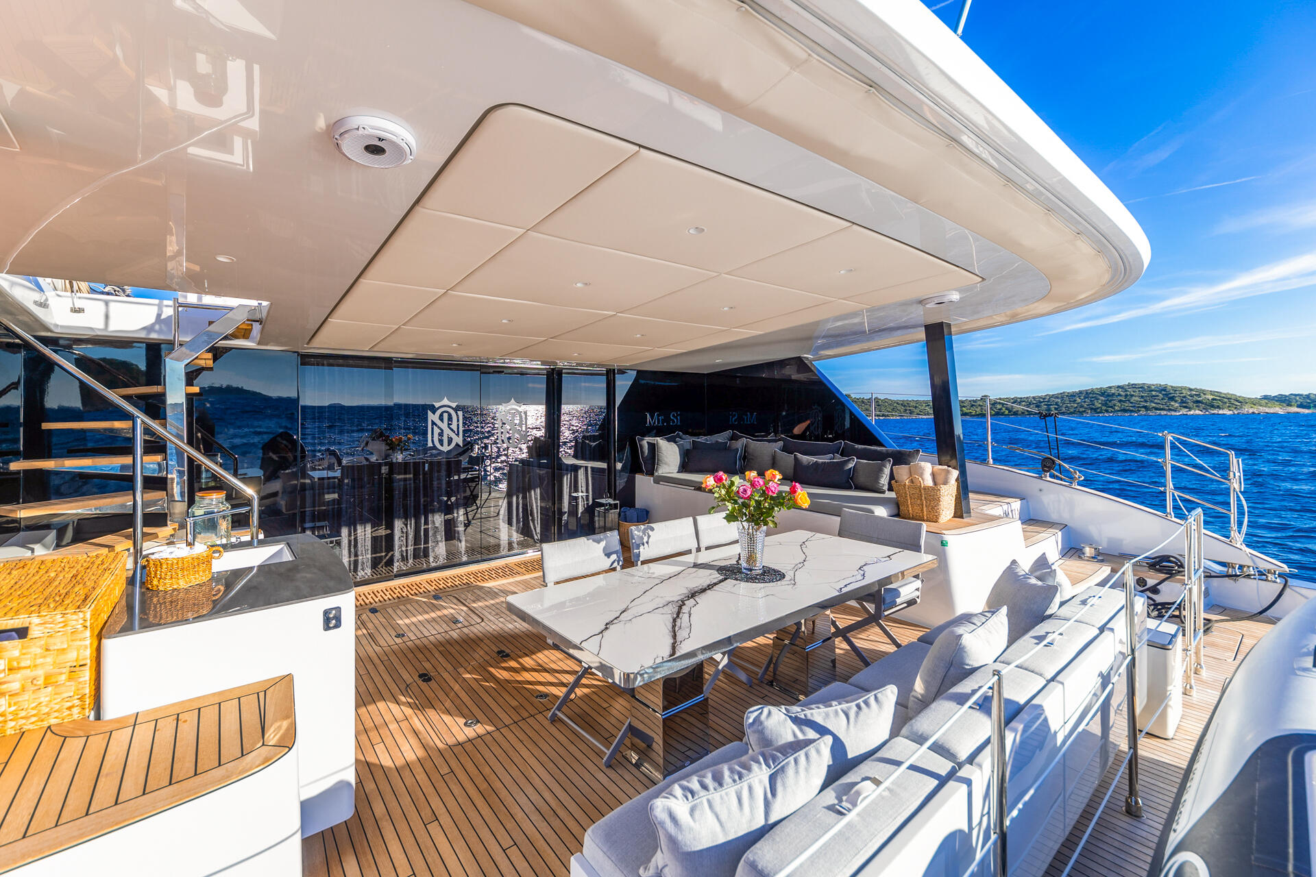 Mr. Si stands out for her exceptional emphasis on outdoor living and well-defined social areas across every deck. The expansive flybridge is a key highlight, offering a shaded lounge, bar, dining space, sun pads, and an additional helm station, all positioned to provide views whether underway or at anchor. Meanwhile, the aft cockpit serves as a welcoming gathering space, directly connected to the hydraulic swim platform for effortless access to the sea. Forward, the sunken lounge and twin trampolines create yet another inviting relaxation zone. Combined with an extensive selection of water toys, Mr. Si delivers a dynamic and engaging charter experience designed for both leisure and activity.