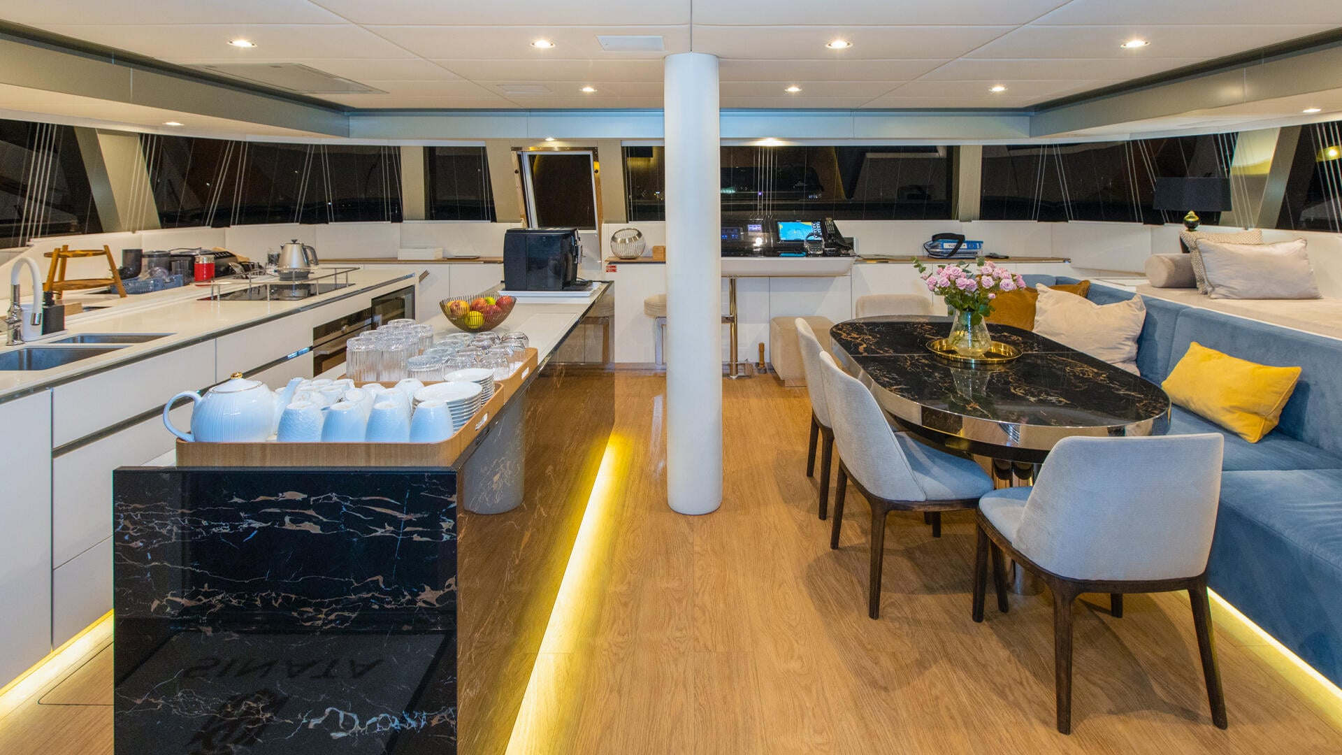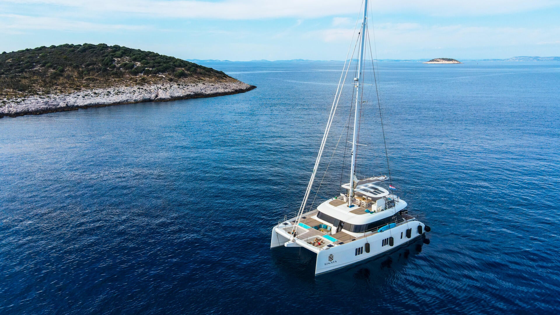 Luxury catamaran Sinata is a 18.43 m Sunreef 60 designed to offer generous space, stability and comfort, while cruising. Her catamaran hull provides excellent balance and smooth performance at sea, making her suitable for relaxed cruising and Island hopping. Moreover, Sinata features an open plan main salon with a connected galley, allowing for practical use of space and easy movement between interior and exterior areas. She accommodates up to nine guests and is operated by a professional crew of three, ensuring attentive service during charter.